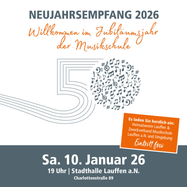 Gemeinsam mit dem Heimatverein Lauffen e. V. möchten wir Sie zum Start in unser Jubiläumsjahr am 10. Januar um 19 Uhr in die Stadthalle Lauffen einladen. Neben abwechslungsreichen musikalischen Darbietungen erwarten Sie unter anderem interessante Fakten zur Geschichte unseres Musikschulgebäudes, ein fotografischer Rückblick auf 50 Jahre Musikschule, kleine Überraschungen und selbstverständlich ein Getränk zum Anstoßen.